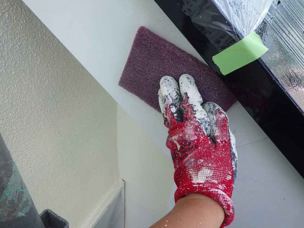 板金部の塗装を行う前に、高圧洗浄では取り除けなかった汚れや錆を手作業で取り除いていきます。また板金表面に小さな傷をつけることで、塗料との密着性を高め耐久性を向上させます。ナイロン製のマジックロンを使用していて、劣化の状況によって目の細かいマジックロンと目の粗いマジックロンを使い分けていますが、破風や鼻隠しは錆がないので目の細かいマジックロンを使用しました。