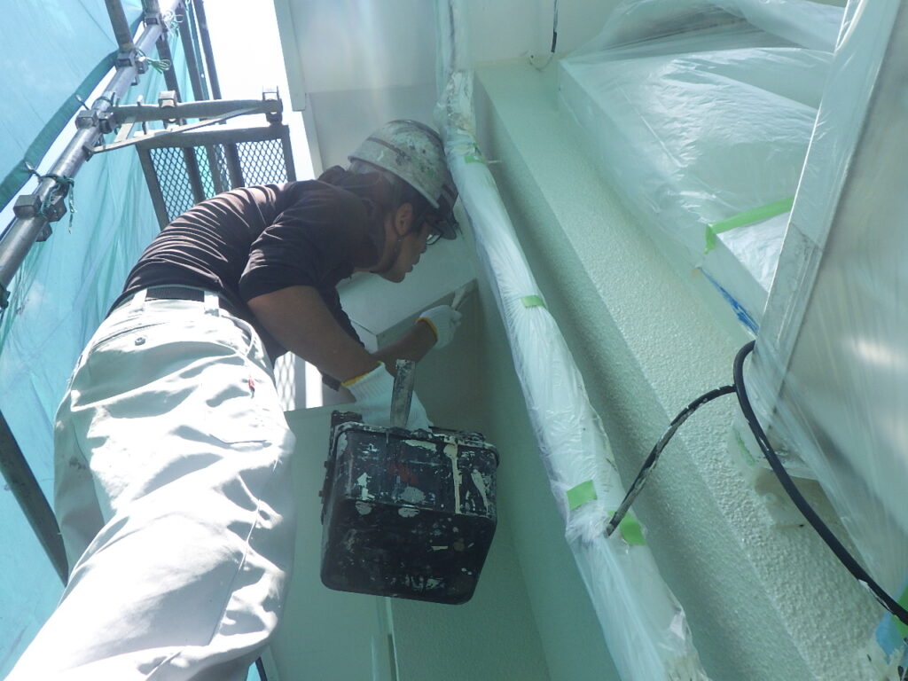 外壁との見切りは刷毛で丁寧に行います。