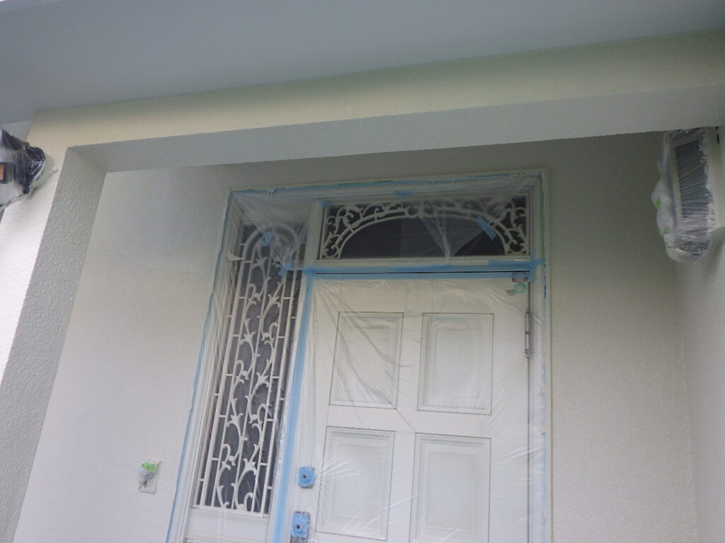 軒天がすでに仕上がっていましたが外壁が仕上がっていない為、軒天側の見切りにマスキングテープを真っすぐなラインになるよう養生を行い、ミニローラーや刷毛で二回塗装を行いました。