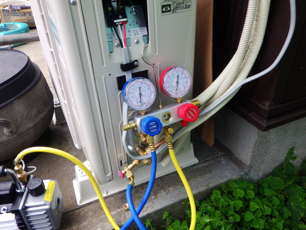 エアコンの設置時や移設を行う際には必ず行わなければならない作業で、室内機と室外機を繋ぐ配管の内側には銅管があり、銅管の中にある冷媒ガスを室外機に閉じ込め、配管の空気を抜いて真空状態にする作業です。