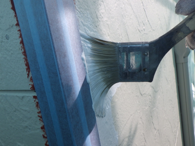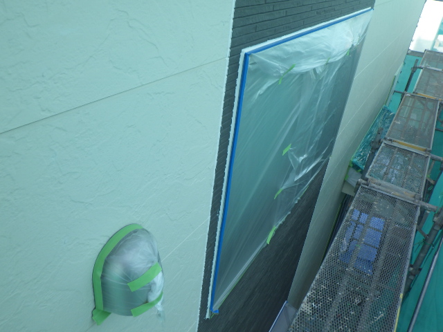 窓周りは既存塗装の見切り線から1~2ミリほど離して養生をして、躯体に塗料が付き見切り線がきれいに出えるように養生をしていきます。