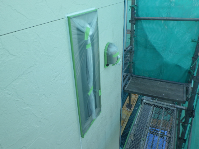 また、ステンレス製の排気ダクトなども塗装しませんので、マスカーで覆い養生をしました。