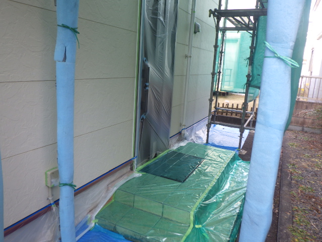 玄関先のアプローチや濡れ縁など居住者様が出入りする場所には破れずらく滑りにくいノンスリップマスカーを引き込みました。