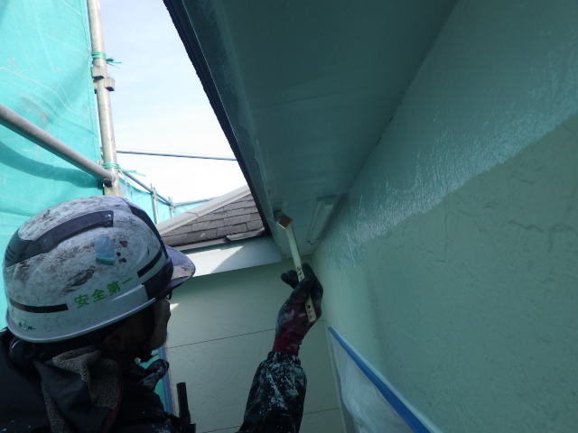 軒天の見返し側やローラーでは塗装できない部分に刷毛で塗料を塗り込みながら、平面をローラーで塗装していきます。