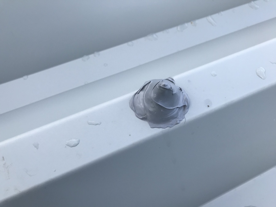 折半屋根のボルトの上にコーキング処理をしています!以前、他社の点検に行ったときにかなり大きな屋根でしたが全体にこのようにコーキングをしていました!