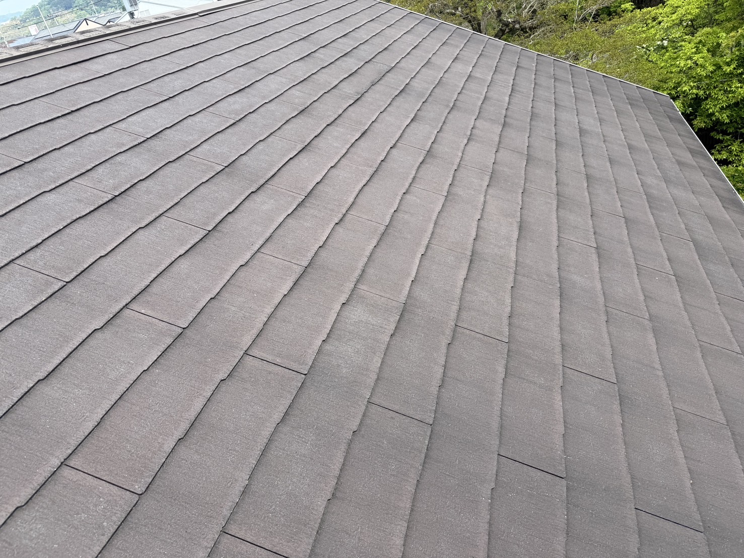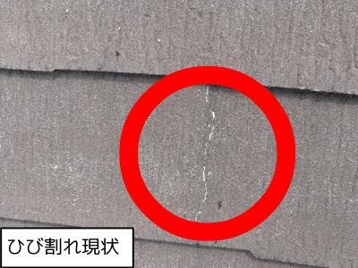 屋根全体に確認しました、全体的に色褪せなどは確認、スレート一枚ひび割れ発見、季節差の膨張・収縮など台風や強風・飛来物の衝撃・乾燥や湿気の繰り返しなどで