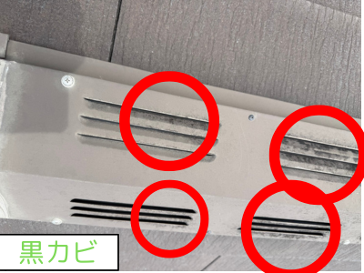 棟板金の空気工が黒カビが発生していました、空気工は通気を目的とした構造ですが、雨風にさらされやすく、ホコリや湿気がたまりやすい部分でもあります。そこに日陰や風通しの悪い環境が加わると、湿度が高まり、黒カビが発生しやすくなるのです。