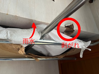 そこの部分から雨水がツタり!雨水が垂れていますね!!これは天井部分からつまり屋根が原因になります!!!