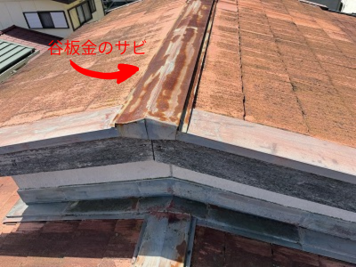 雨で谷板金が全体にサビていますね!!!この谷板金が錆びて穴が開くと、そこから雨水が屋根内部や下地へ浸入してしまい、雨漏りの大きな原因となります。特に、昔ながらのトタン製の谷板金は経年劣化によってサビが進行しやすく、注意が必要です。サイドもこのように隙間が空いてしまっていますね!!