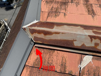 今回に雨漏りの原因はこの谷板金からの原因で考えられます!このように隙間があると雨水の侵入の恐れがあります!