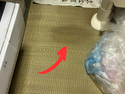 雨の日は確実に天井から雨水が落ちてくるので畳が雨染みできていますね!!写真では見えていませんが畳が雨水で腐食しているのも確認できます。