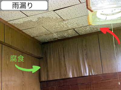 今回のお客様は、「雨の日に天井からかなりの雨水がポタポタと落ちてくるかなり天井が腐食」ということでお問い合わせをいただきました。