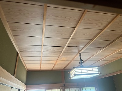 和室の「めかし天井(和風の格子状に組まれた天井板)」にシミや歪みが見られました。天井板が剥がれかけている部分もあり、長期間の雨漏りが原因で木材が膨張・収縮を繰り返し、固定が弱くなっている状態です。
