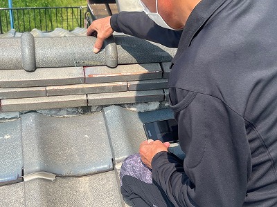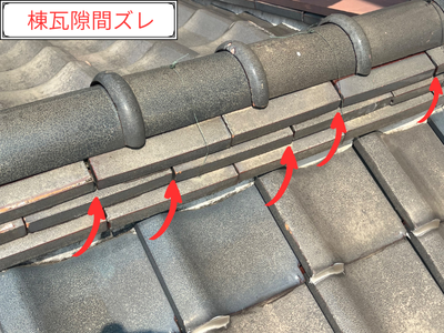 棟瓦(屋根の頂上部分に積み重ねてある瓦)」がズレている箇所と隙間が空いているのが見つかりました。