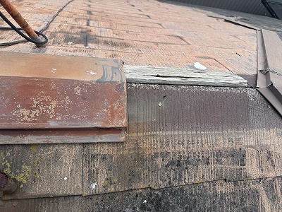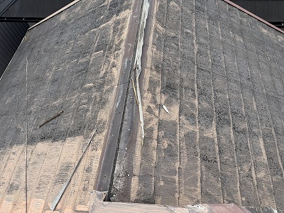 右の写真のような劣化になるとコーキング補修がかなり厳しい状態になりますので、これ棟板金交換工事になります。基本カラーベスト屋根が全体に劣化している場合はなどは棟板金も同じく劣化している可能性は十分高いです!