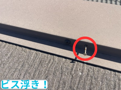 ビスが浮き上がっている可能性もあり!本来ビスがしっかり屋根材に固定されていれば防水性を保てますが、経年劣化や下地材(木部)の収縮によって浮いてしまうことがあります。