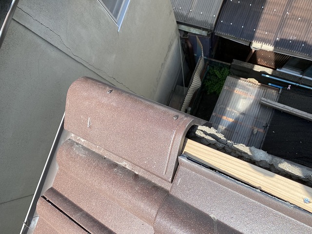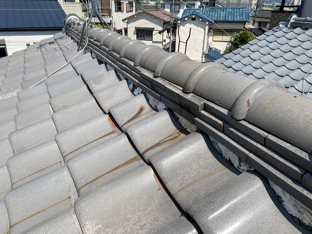 棟の部分に本来なら銅線などで緊結しているのですが、経年劣化のためちぎれて無くなっております。3段積んでいるのし瓦もずれてきていました。