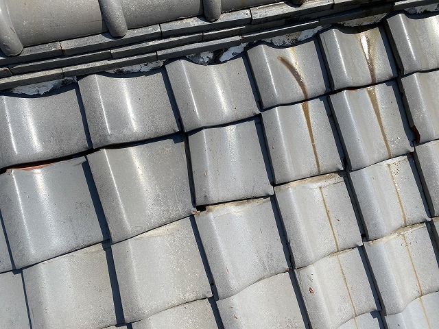 屋根には勾配があり常に下向きに力がかかっています。瓦の下には屋根土がありその土と瓦がくっついているのですが長い年月とともに土と瓦が剥がれて写真のように地瓦がずり落ちてきていました。