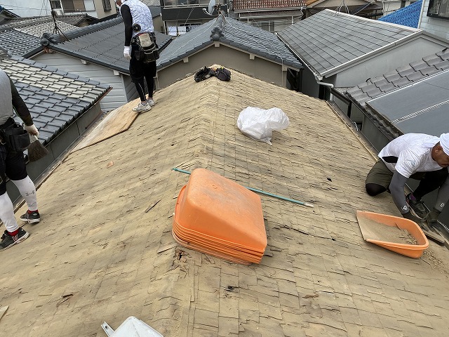 一度既存の瓦と屋根土を解体します。今見えているのは杉皮を薄く並べており現在でいうルーフィングのようなものです。