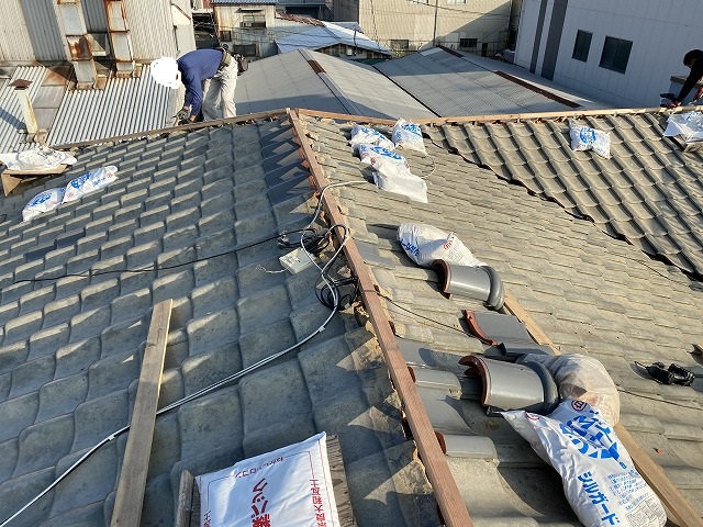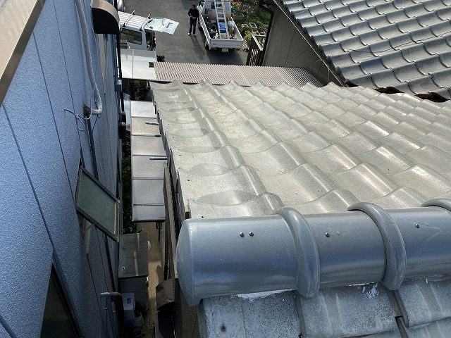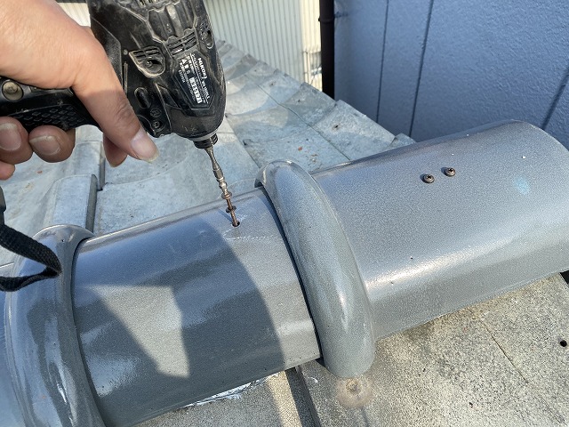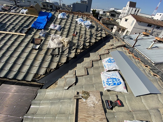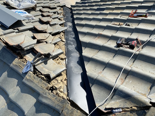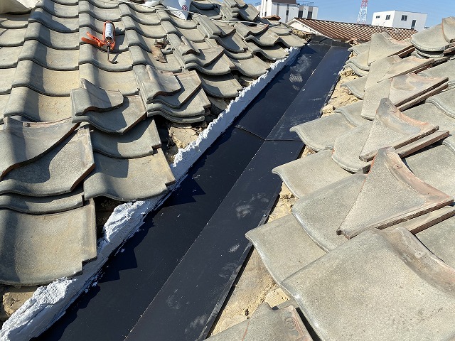 大東市で谷板金入れ替え工事と棟瓦7寸丸工事をしました。(2日目)