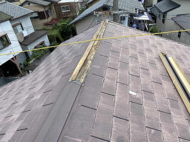写真右側が南側ですが北面の棟板金を固定するヌキ板はあまり腐食していなくて南面が傷んでいるのがよくわかると思います。