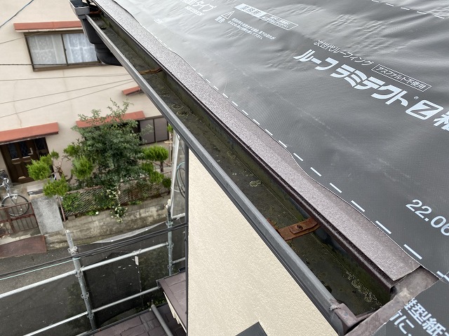 写真のような三角の場所は1枚ずつ切断していき、切った端材はせっかく葺いた屋根に傷がつかないように気を配りながら掃除していきました。