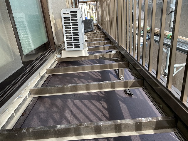 家の裏側には長いベランダがあり潜り込んで作業する事は可能ですが、本体に固定するビス打ちなどが困難だったために一度床板を仮に解体しました。