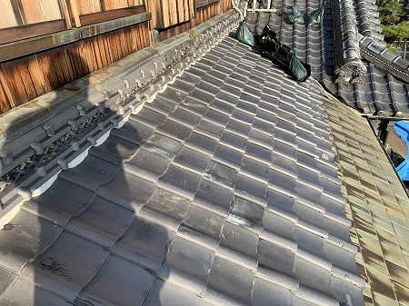 交野市にて入母屋屋根・和形いぶし瓦屋根の点検!棟の面戸漆喰の剥がれや、銅板部分に穴開きが見られました。