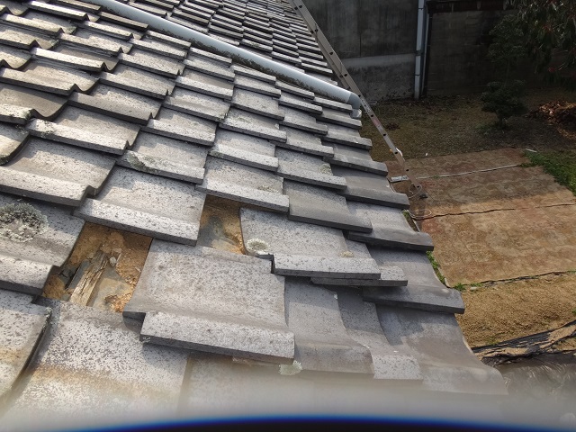 この写真では、誰が見てもわかりますが瓦がずれて落ちかかっています。