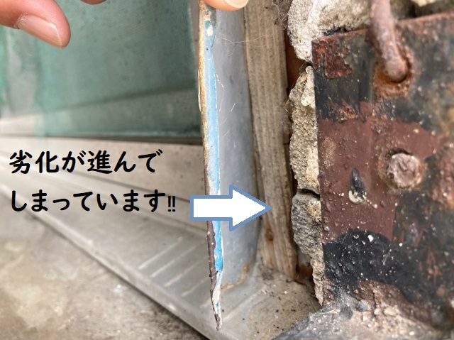 ★サッシ周りの劣化ベランダの出入口に取り付けているサッシは外に面しているため、雨風が当たりやすい場所になります。