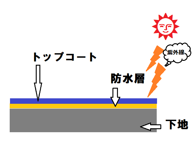 トップコートは塗膜(とまく)を保護してくれるる役割があります。塗る事で表面にツヤが出ます。下にある防水層を守ってくれています。トップコートを塗らないと紫外線などの影響が受けやすく劣化の進行が早くなってしまいます。防水層は下地を雨水から守る!と言う役割があります。防水層が劣化してしまうと建物の内部に雨水が侵入してしまい、最悪の結果雨漏りに繋がってしまいます。雨水を防ぐ層の劣化には十分気を付けなければいけません!!