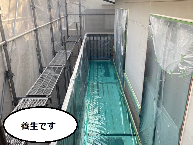 養生とは、塗装をしない部分をシートやテープで覆い、塗料の飛び散りや付着を防ぐ作業です。