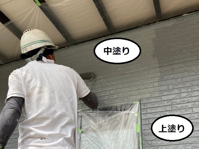 下塗りで作った基盤の上に塗ることで、塗装の厚みを確保し、外壁全体の強度を高めます。