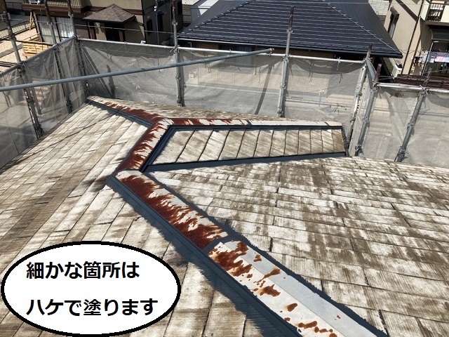 棟板金部分は細かい作業が必要なため、ローラーでは届かない箇所をハケを使って丁寧に塗装しました。