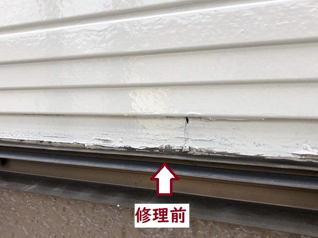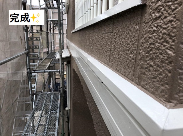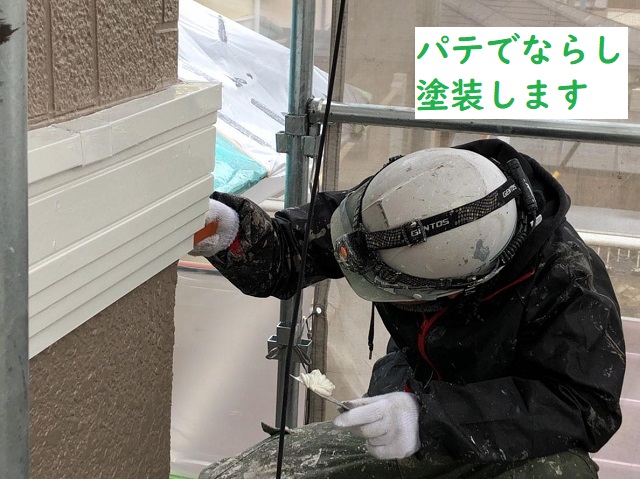 今回の施工では、帯の劣化部分にまずパテを充填し、表面を平らに整えた後、白い塗料で仕上げました。