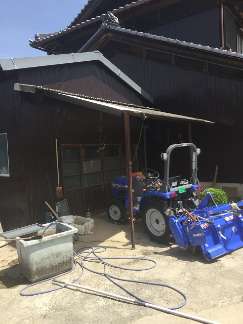 スレート屋根は倉庫側の壁に差し込むように施工されており、昔ながらの工法で防水性を高めています。