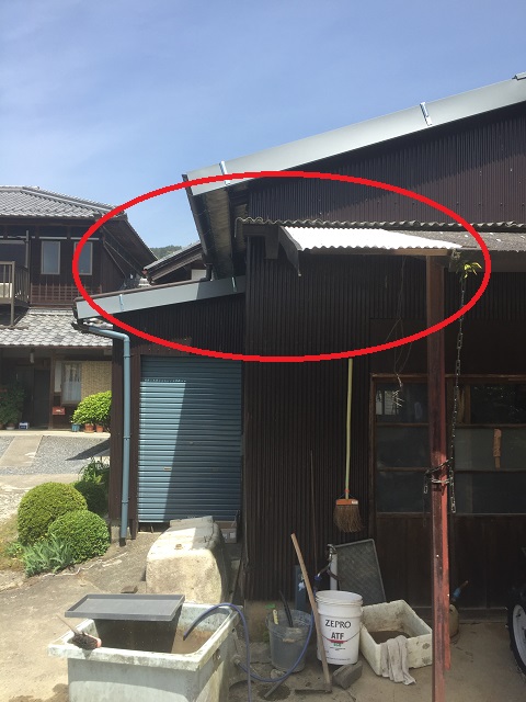 横から見ると、倉庫の波板とスレート屋根の取り合いに段差があり、隙間ができている状態でした。