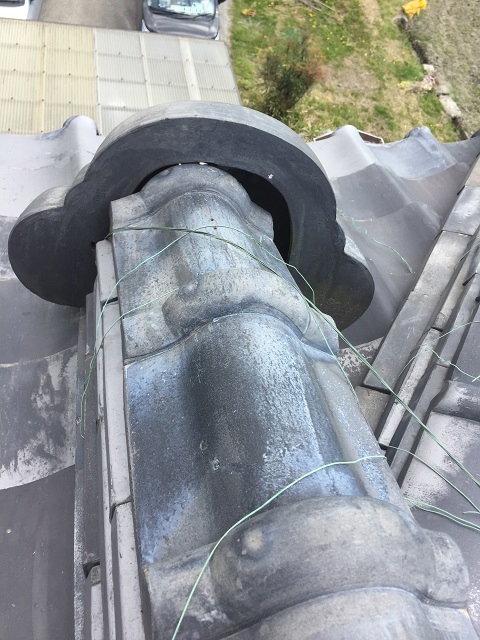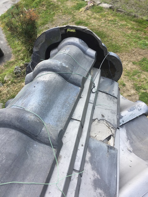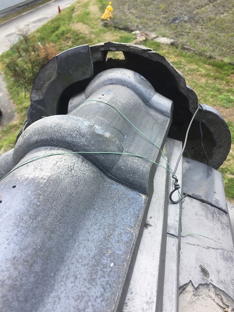 棟の最上部にある冠瓦(かんかわら)がずれて、割れた鬼瓦の内部まで移動していました。