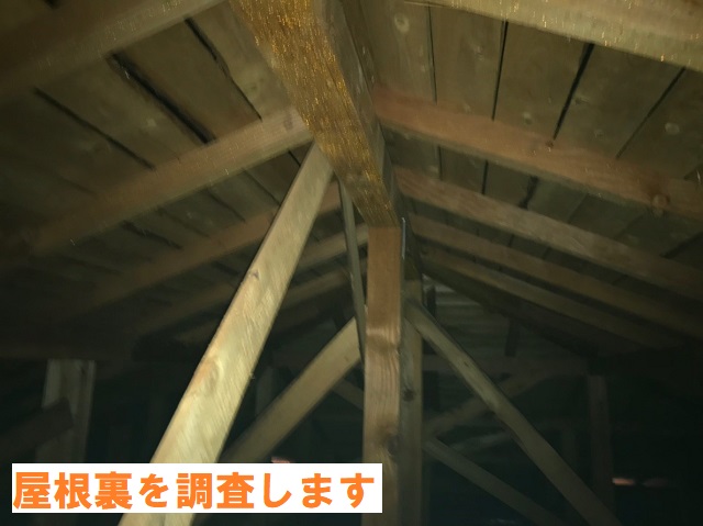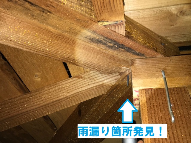 ペンライトで照らすと、雨水が染み込んだ跡がハッキリと残っており、雨漏り箇所を特定することができました。
