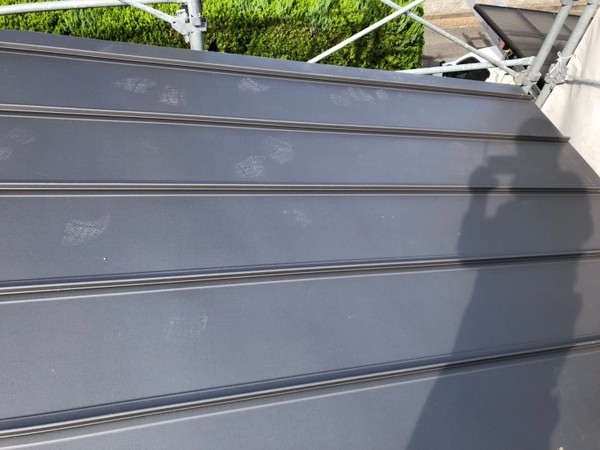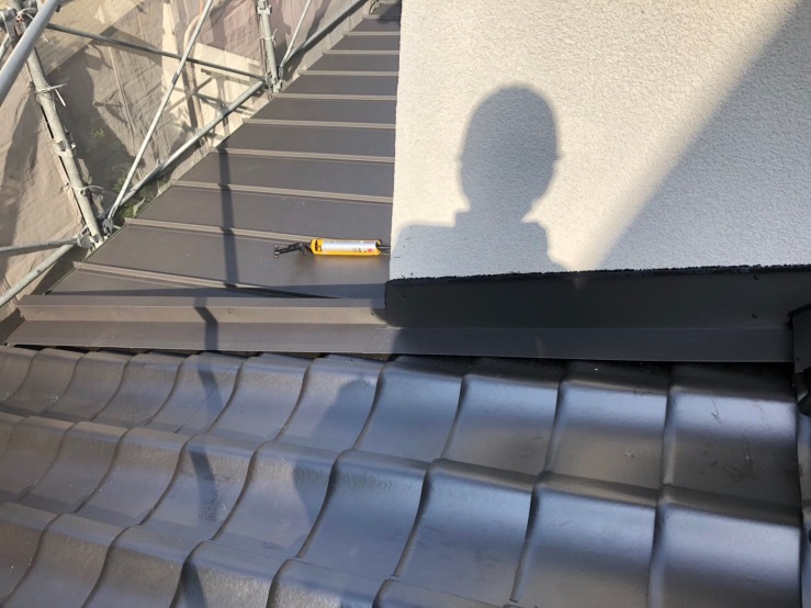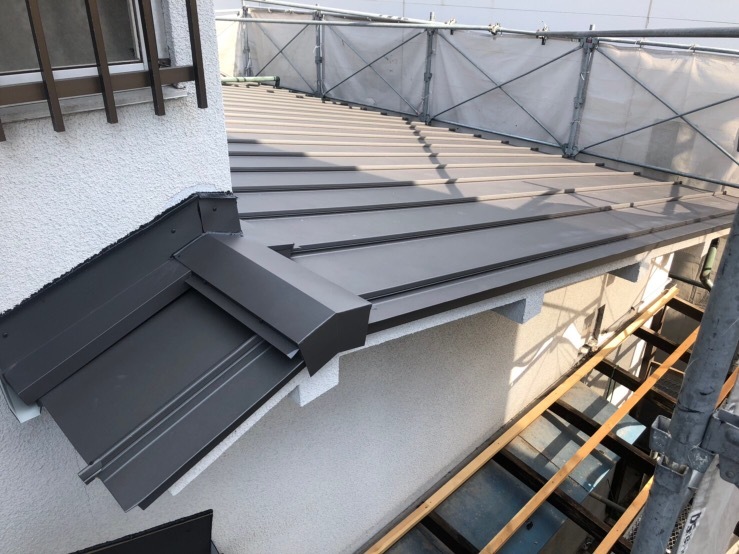 壁際との取り合いの板金役物を取り付け、板金屋根の工事が完了です。