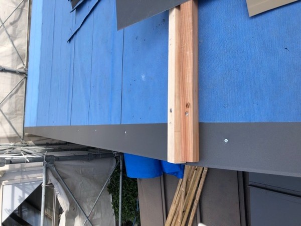 この家では1階部分に瓦屋根とクイックルーフが重なる部分がありますので、その部分に木下地で板金用の下地を取り付けます。