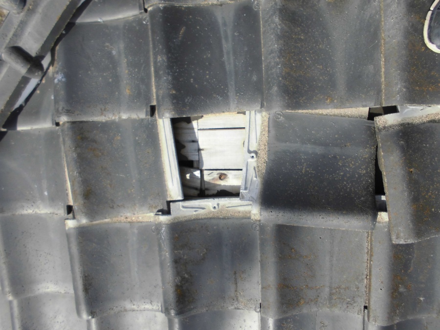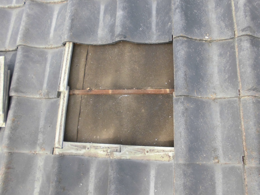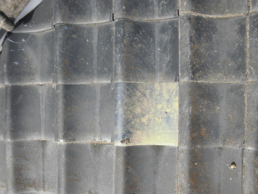 雨漏り箇所を予備の瓦で塞いだ写真です。(応急処置) 瓦自体は、非常に剥がれやすく、少しの風でも持ち上がってしまいそうです。またルーフィングの劣化もあり、どこで雨漏りしてもおかしくない状態だと考えられます。 オーナー様へは、今回の調査を踏まえ、全体的な屋根のメンテナンスをご検討いただく時期とのアドバイスをいたしました。 (冨田)