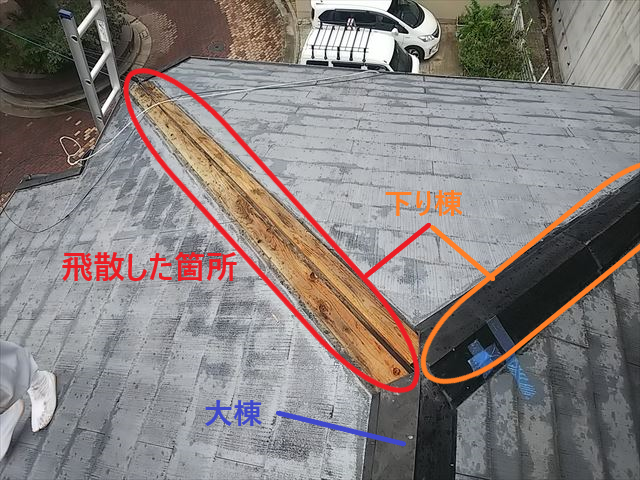 下り棟の板金が飛散し、棟板金の下地材が露わになった状態でした