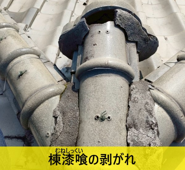 棟(屋根の頂上部分)の漆喰も経年劣化により割れて剥離している状態でした。