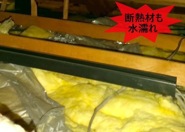 グラスウール断熱材も水濡れしており、雨漏りがかなり進行していることがわかりました。