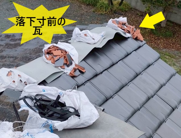 さらに棟の端ギリギリにも割れた瓦が置かれており、風や振動で落下する危険が極めて高い状態でした。