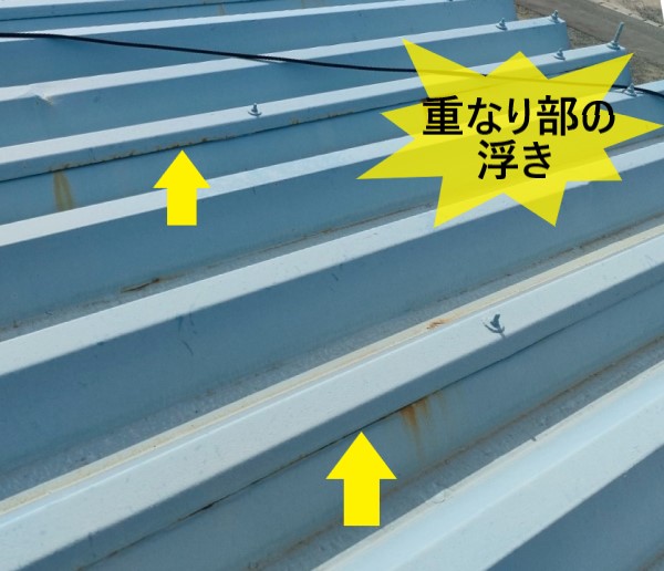 | 3. 屋根接合部からの漏水 | 屋根には多くの接合部があり、隙間ができて雨漏りする原因になります。不適切な施工でも漏水するケースがあります。 | ▶折板屋根の重なり部が浮いて雨漏りした現場 |