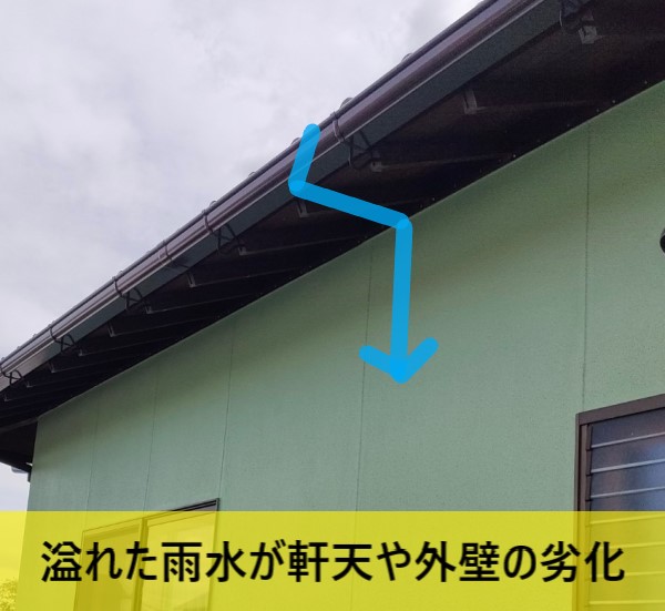 オーバーフローとは、雨樋の排水能力を超えた雨水が流れ込み、樋からあふれ出してしまう現象です。