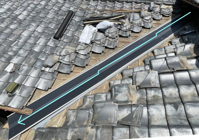 谷板金にかぶさっている瓦を一度取り外す必要があります。