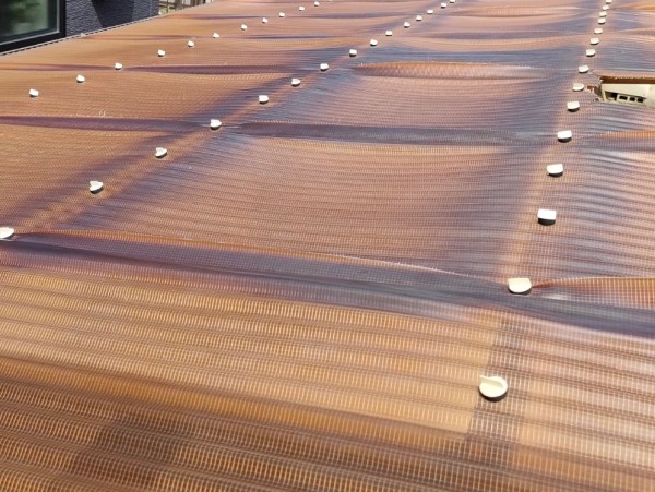 塩ビ製波板は耐久性が低く、耐用年数も1~3年と短いため、ポリカ製の波板に全面張替えを行うことになりました。